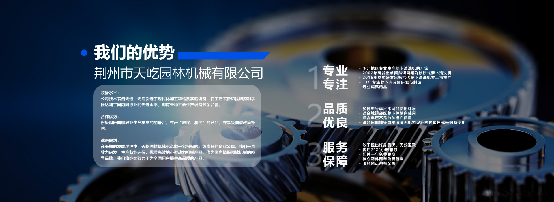 荊州市天屹園林機(jī)械有限公司坐落于歷史文化名城湖北省荊州市荊州區(qū)。本公司是一家從事小型機(jī)械動(dòng)力產(chǎn)品研發(fā)、生產(chǎn)的獨(dú)資民營(yíng)企業(yè)。公司注冊(cè)資金500萬(wàn)元,現(xiàn)有員工60余人、公司在全國(guó)多個(gè)省市區(qū)設(shè)有多家經(jīng)銷(xiāo)和服務(wù)點(diǎn),在國(guó)內(nèi)創(chuàng)“售前培訓(xùn)、產(chǎn)品銷(xiāo)售、配件供應(yīng)、售后服務(wù)”四位一體的營(yíng)銷(xiāo)模式。專(zhuān)門(mén)配備售后服務(wù)車(chē),設(shè)立售后服務(wù)備件庫(kù),以在第一時(shí)間滿(mǎn)足用戶(hù)的不同需求。 經(jīng)營(yíng)范圍:果蔬清洗機(jī)(白蘿卜清洗機(jī),胡蘿卜清洗機(jī);荸薺清洗機(jī);土豆清洗機(jī);冬瓜清洗機(jī);生姜清洗機(jī)等)。公司主要產(chǎn)品有園林機(jī)械、植保機(jī)械等,其中公司以蘿卜清洗機(jī)系列占主導(dǎo)地位。銷(xiāo)售網(wǎng)絡(luò)及售后服務(wù)遍布國(guó)內(nèi)多個(gè)省市。 裝備水平:公司技術(shù)裝備先進(jìn),先后引進(jìn)了現(xiàn)代化加工和檢測(cè)實(shí)驗(yàn)設(shè)備,使工藝裝備和檢測(cè)控制手段達(dá)到了國(guó)內(nèi)同行業(yè)的先進(jìn)水平,擁有各種主要生產(chǎn)設(shè)備多余臺(tái)套。 合作優(yōu)勢(shì):積極響應(yīng)國(guó)家農(nóng)業(yè)生產(chǎn)發(fā)展的的號(hào)召,生產(chǎn)“惠民、利民”的產(chǎn)品,并享受?chē)?guó)家政策補(bǔ)貼。 戰(zhàn)略規(guī)劃:在長(zhǎng)期的發(fā)展過(guò)程中,天屹園林機(jī)械承諾做一名積極的,負(fù)責(zé)任的企業(yè)公民,我們一直致力研發(fā),生產(chǎn)節(jié)能環(huán)保,優(yōu)質(zhì)高效的小型動(dòng)力機(jī)械產(chǎn)品,作為國(guó)內(nèi)植保園林機(jī)械的************,我們將繼續(xù)致力于為全國(guó)用戶(hù)提供優(yōu)質(zhì)的產(chǎn)品。 MORE
